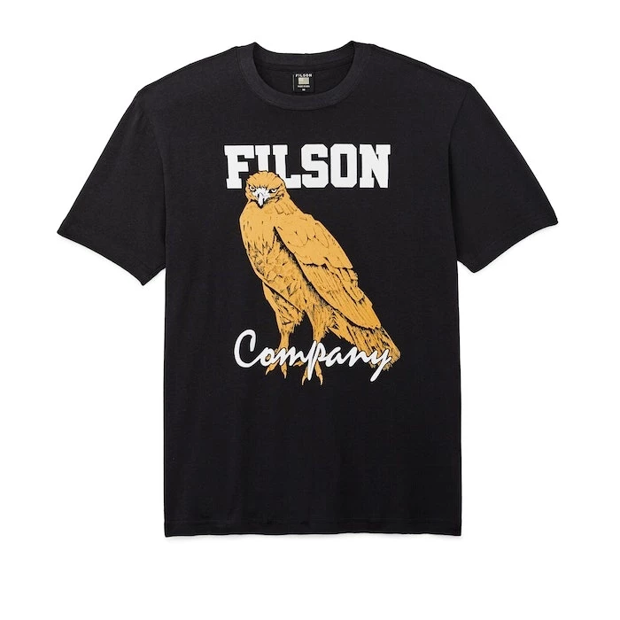 Our Pioneer Graphic T-Shirt is proudly made in America with U.S.-sourced 6.5-oz. cotton. Much more robust than typical T-shirt fabrics, it has a dry-hand feel and maintains its structure for season after season of wear. The collar is a durable rib-knit that holds its shape well. The custom graphics are created by the Filson art team and are exclusive to this shirt.