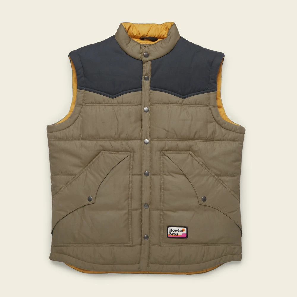 The Rounder Vest ropes the cold on every range with its distinct western styling, core-warming Primaloft® insulation, and water resistant polyester micro rip-stop outer shell. Loaded with cool features, the Rounder has a corduroy western yoke, Howler Tie Down patch, 3″ stand up collar, and unique dual-use front pockets. You’ll be the envy of the bunkhouse.Â