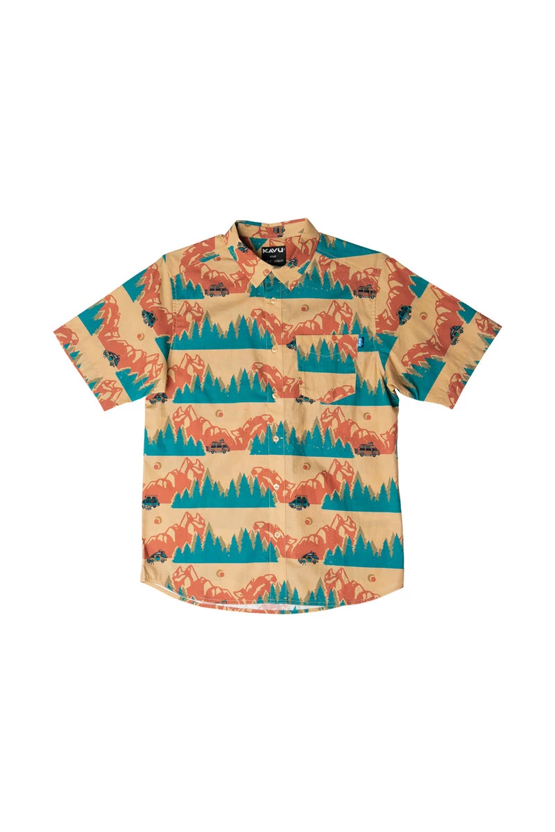 Casual fit, short sleeve button up shirt, stand collar, single chest pocket, dyed to match pearlized buttons with satin finish, back yoke panel with box pleat and locker loop, curved hem.